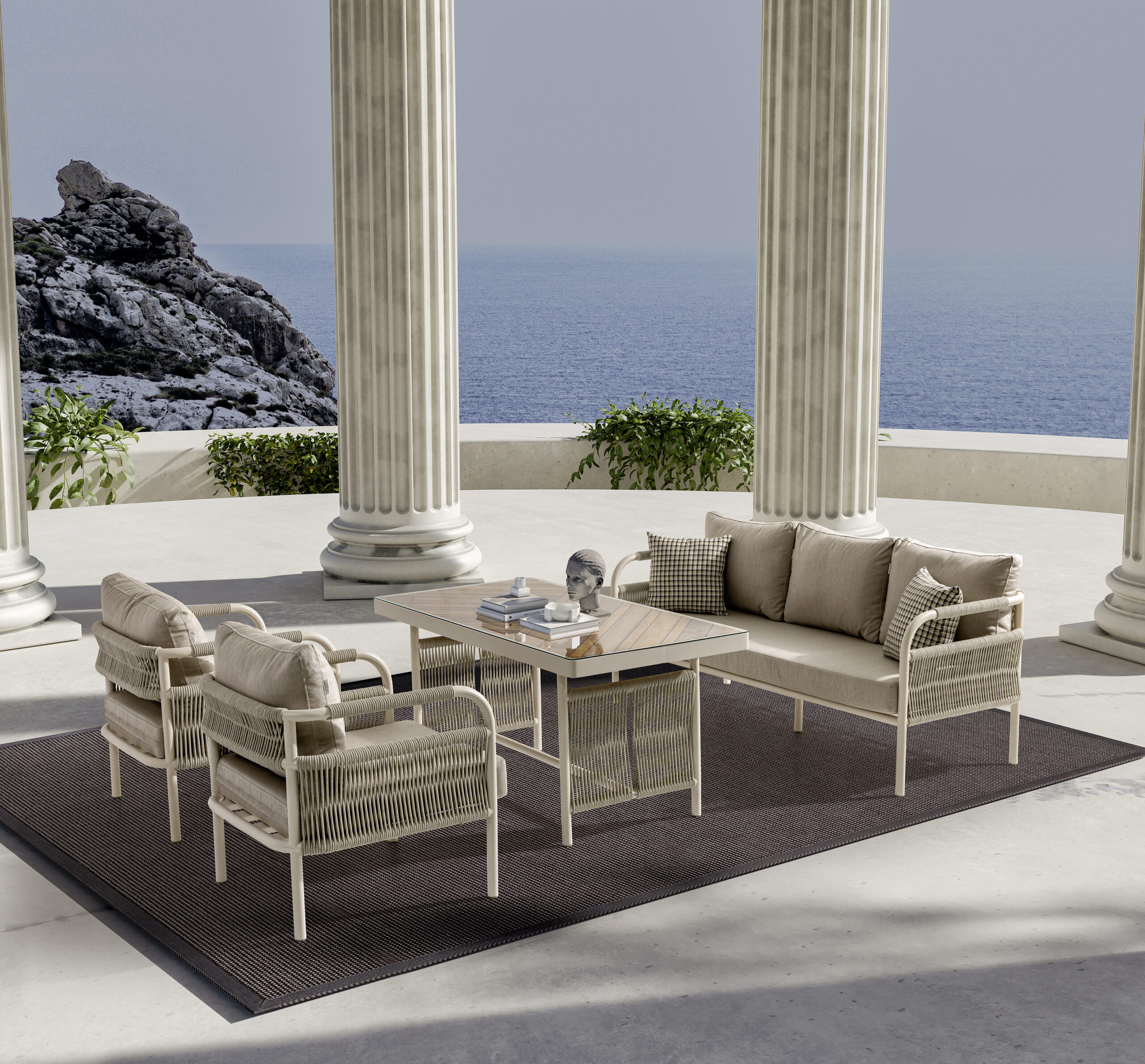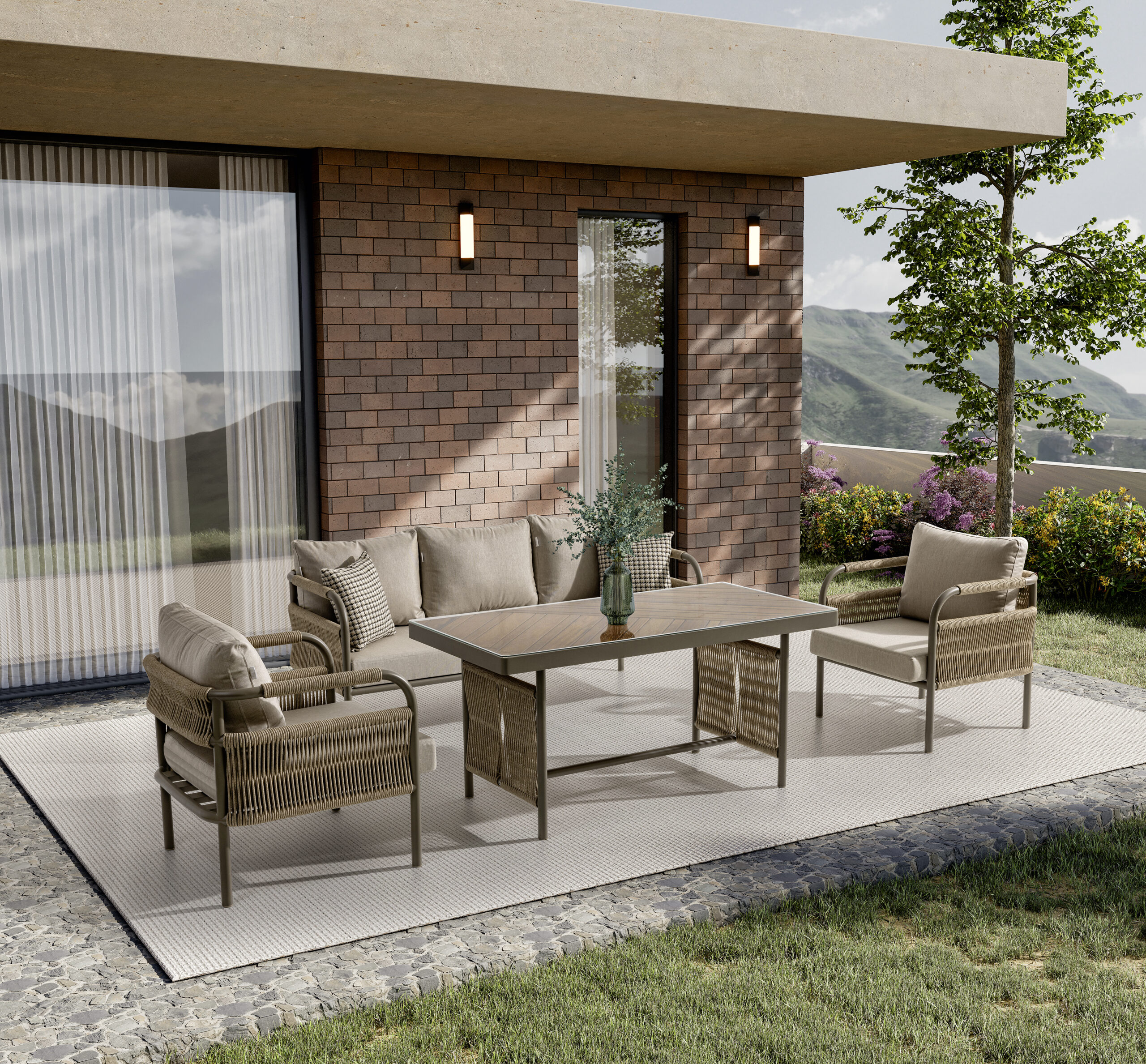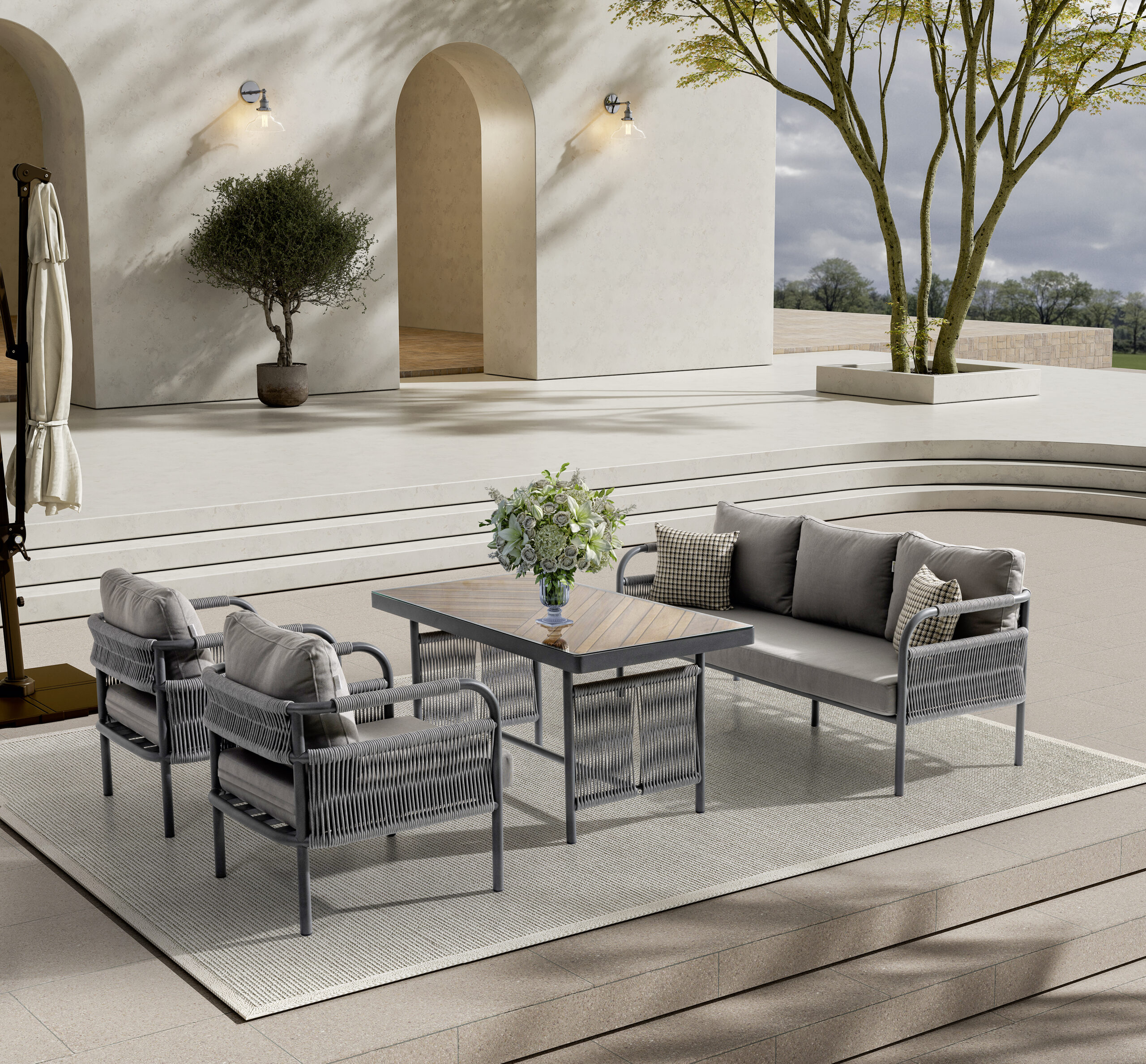 Uzun ömürlü alüminyum gövde, İreko ağacı ve UV stabilizatörlü ip örgü ile hem şıklık hem dayanıklılık sunar.